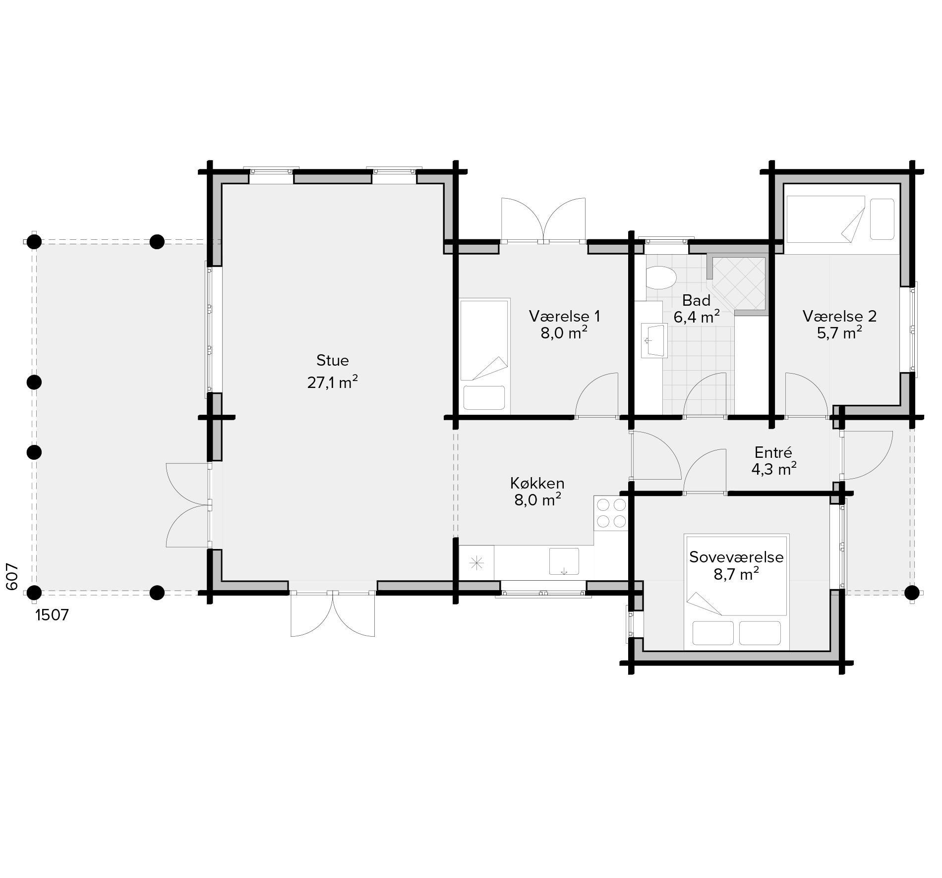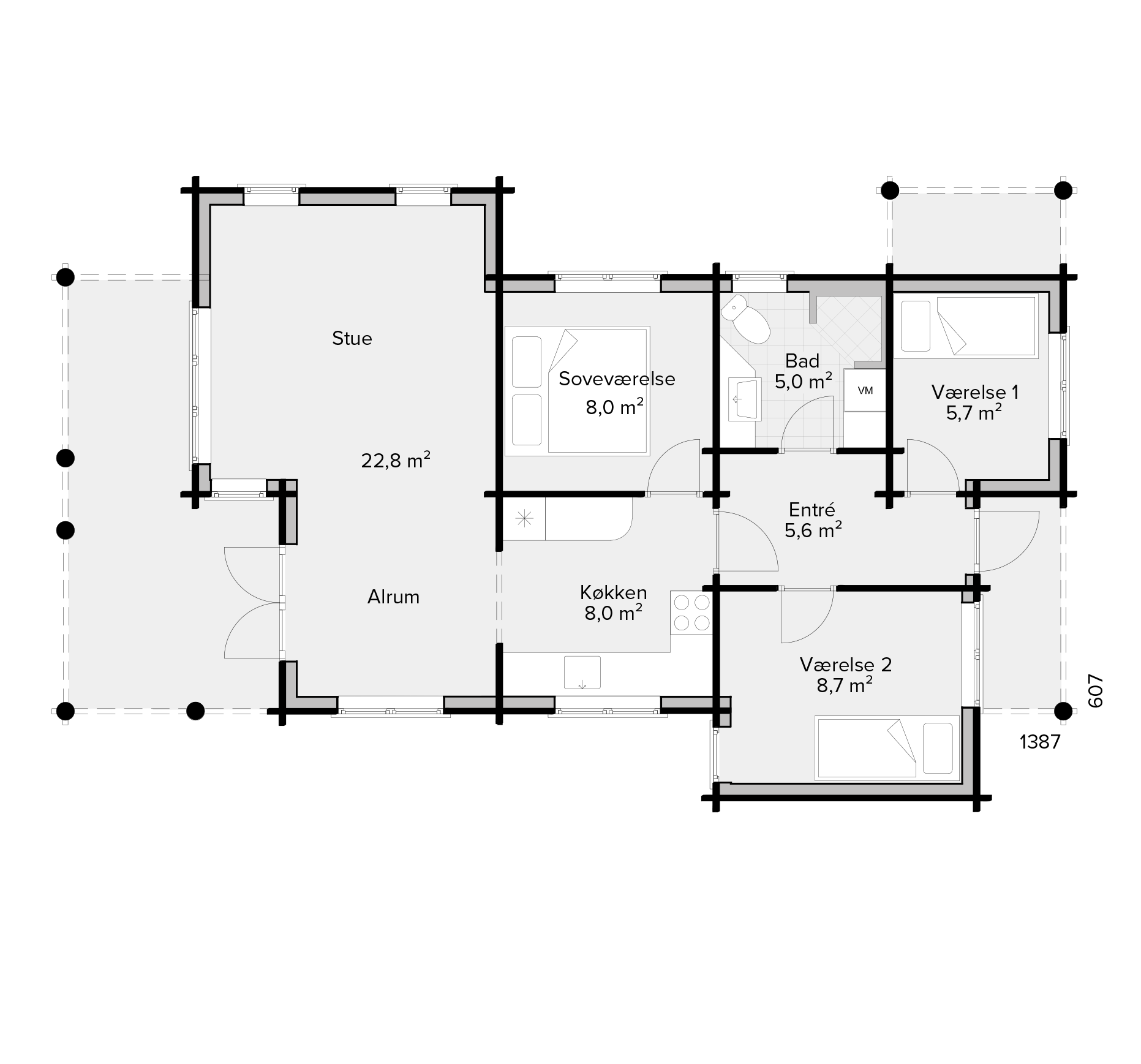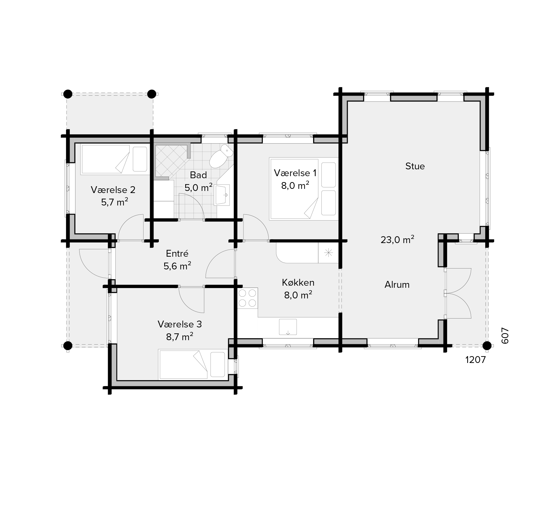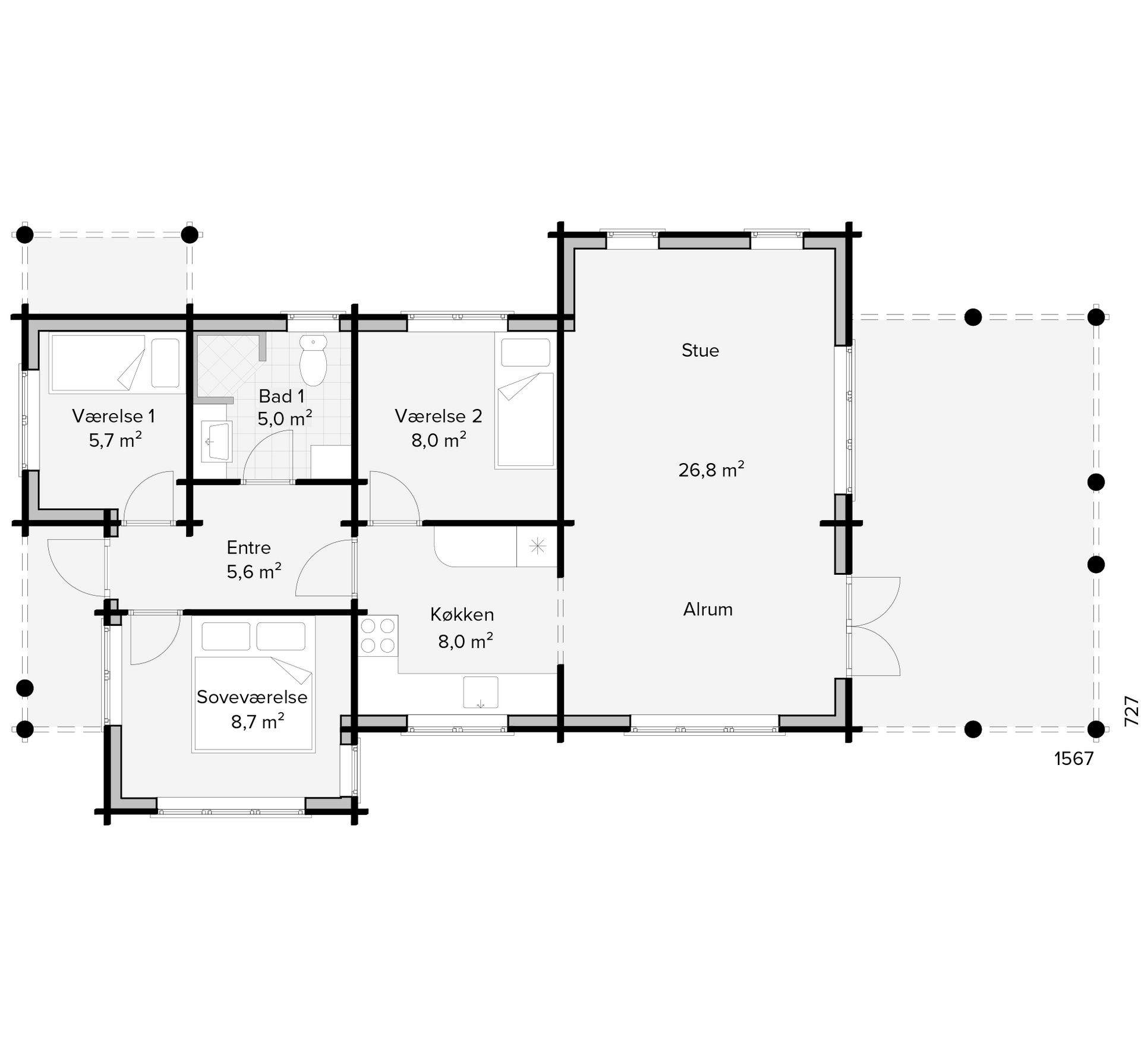 Sande Bjælkehus udføres med en taghældning på 22° med sten eller græs på taget. For yderligere information er du velkommen til at kontakte vores byggerådgivere.